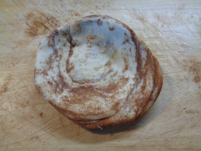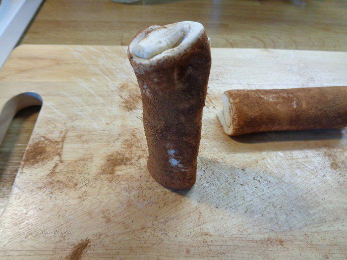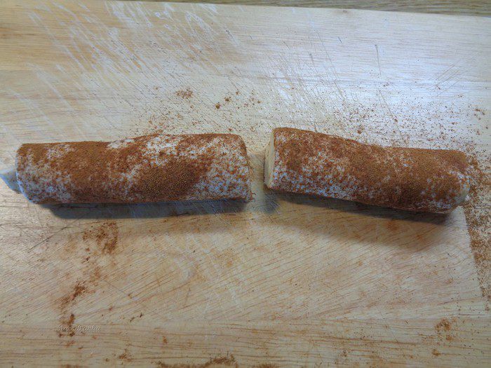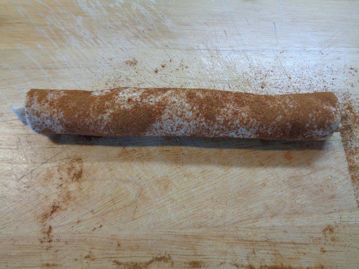 Перевернуть лист теста и свернуть трубочкой. Корица должна остаться вверху.