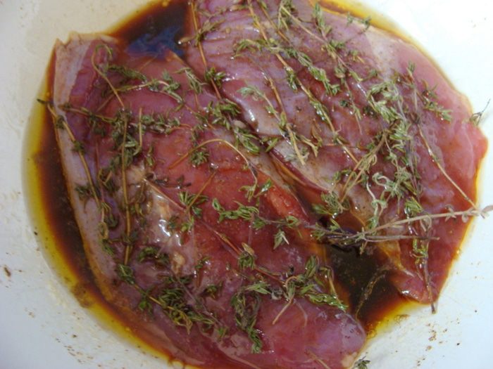 Соевый сойус смешать с маслом, перцем и солью. Замариновать утку, обложив ее веточками тимьяна. Оставить на 1 час.
