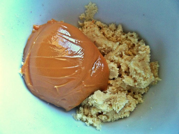 Соединяем ореховую муку и сгущёнку-варёнку, пропорции дело вкуса!