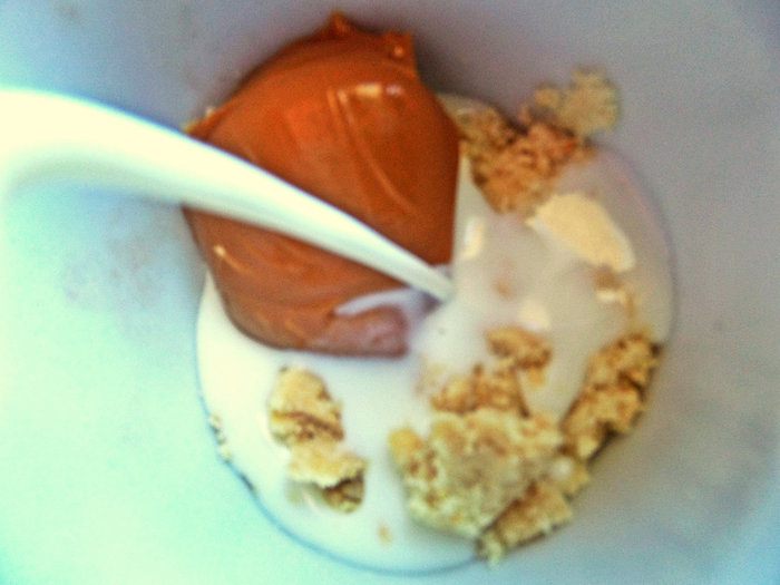 Разбавляем молоком, чтобы перемешать до кашеобразного состояния. Сначала добавила 3 ложки, потом потребовалось ещё.
