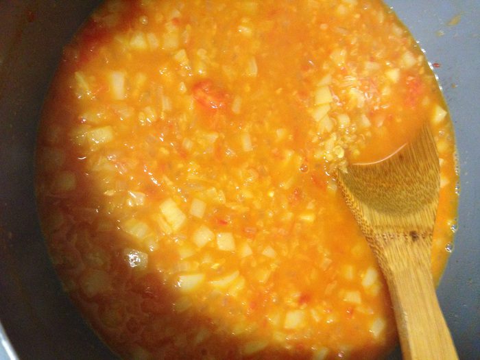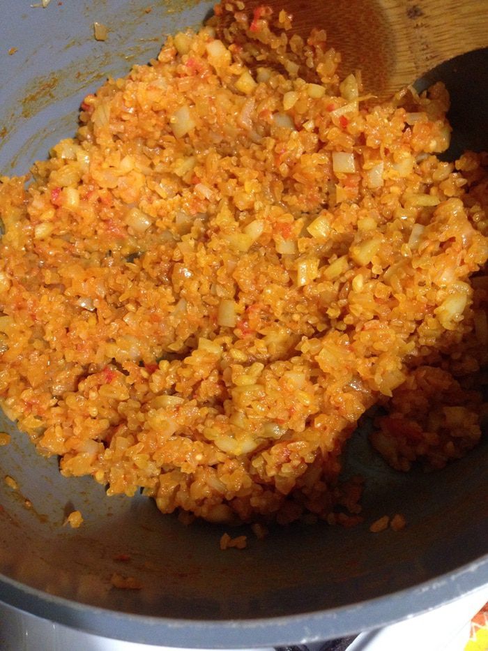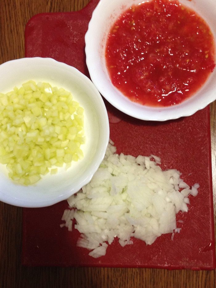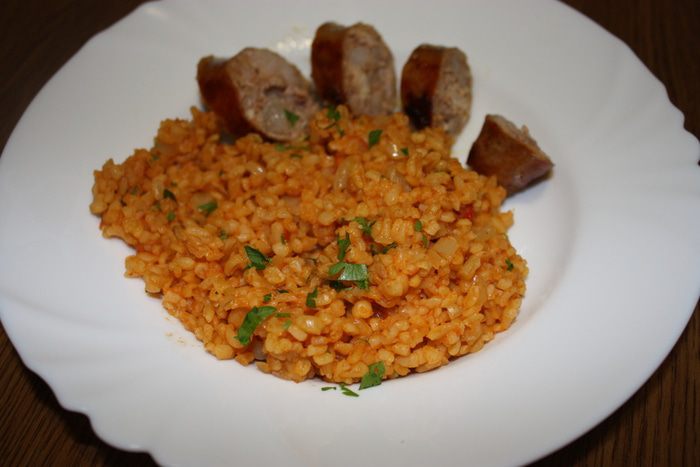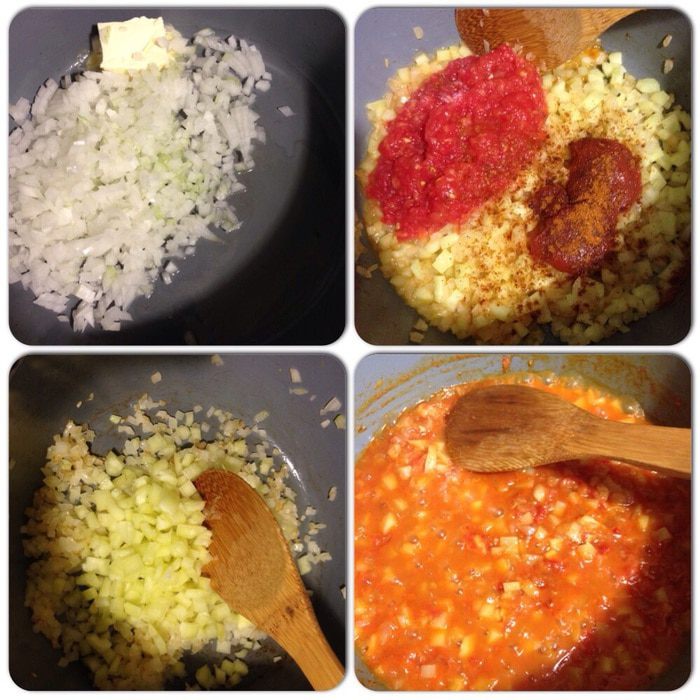 В кастрюле с толстым дном разогреваем масло, добавляем сливочное масло, пассируем лук на медленном огне минут 5. Затем добавляем перец, тушим минут 5. Добавляем помидоры, томатную пасту (в Турции добавляют пасту из перца, у нас ее не найти), добавляем сладкую молотую парику и совсем чуть чуть острого перца, тушим минуты 3.