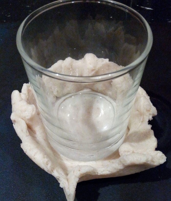 В центр раскатанного круга из теста нужно поставить стакан, чтобы придать заготовке форму кружки.