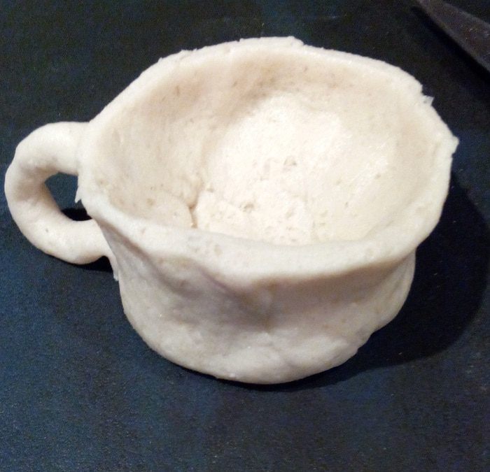 Далее убираем стакан и лепим нашу кружку, придавая ей желаемую форму. После этого отправляем ее в духовой шкаф, разогретый до 200 градусов на 20 минут.