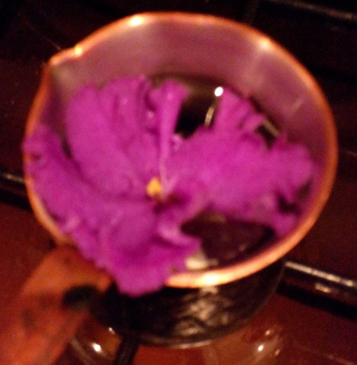 Пока кружка остываем, приготовим кофе. Насыпаем в турку кофе, кладем 2 засахаренные фиалки. Для более насыщенного аромата цветов я добавила 1 свежий цветок. Доводим до кипения, процеживаем.