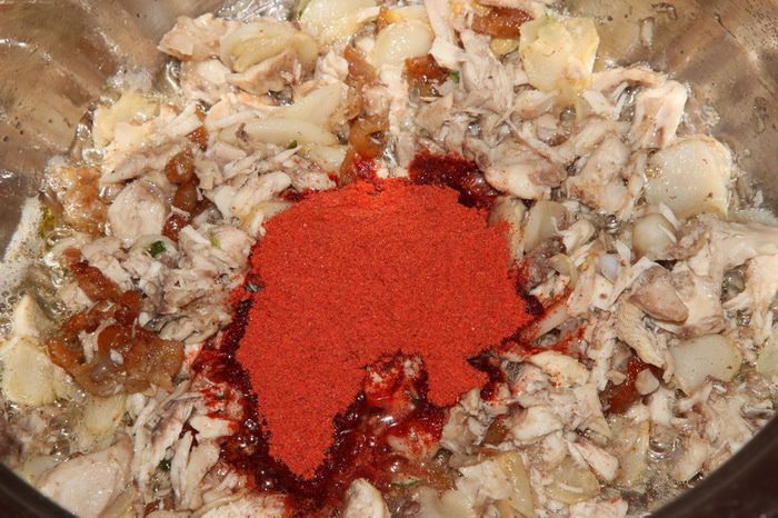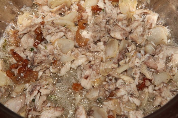 Затем добавляем куриное мясо, поджариваем пару минут.