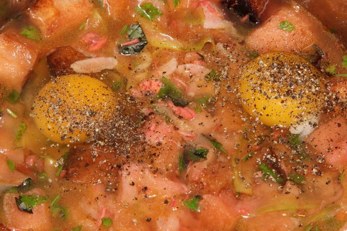P.S. При наличии готового бульона и сухариков суп готовится архибыстро. Поэтому рекомендую приготовить накануне и бульон, и сухарики. Если нет бульона - не беда: вместо куриного мяса покладите ветчину, грамм 100, используйте воду, сухарики готовятся по ходу готовки супа. В моих ингредиентах указан 1 стакан сухариков на 1,5 л бульона: это для очень густого супа. Если Вы такой не любите, смело делите на 3: сухарики поятнут в себя бульон и распухнут. Порций у меня 5, а яиц всего 2: просто нас было двое - по яйцу на порцию. Вроде бы все рассказала.