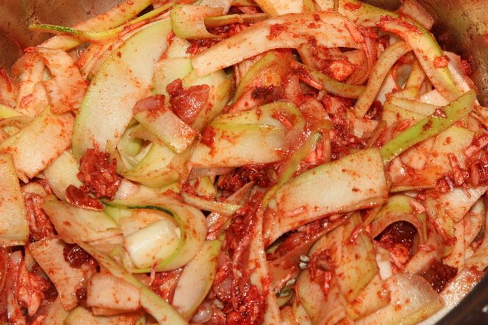Сразу же добавляем нарезанный ножом для чистки овощей цукини. Я нарезала лапшой. Перемешиваем, наливаем немного бульона для того, чтобы не пригорела паприка, иначе суп будет горчить. Пару минут томим.