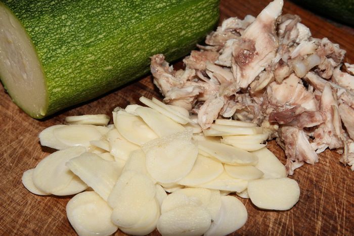 Чеснок чистим, нарезаем на тонкие пластинки, приготовленное куриное мясо тоже нарезаем кусочками, от цукини отрезаем половину.