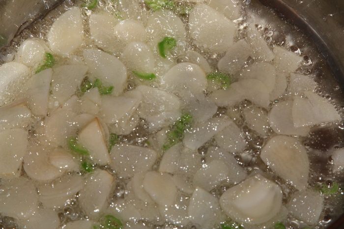 В кастрюлю с толстым дном наливаем масло, прогреваем его и отправляем чеснок и мелко нарезанный чили. Готовим до подрумянивания чеснока, минутки 2-3.