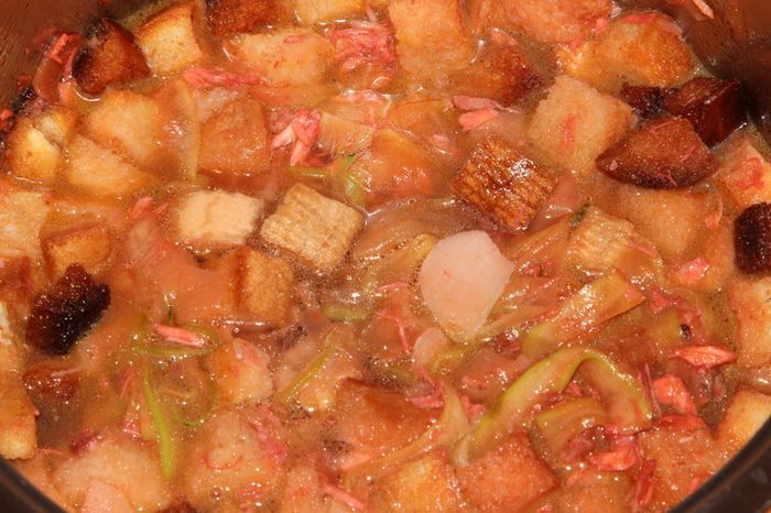 Добавляем сухарики, перемешиваем еще раз и сразу вливаем бульон. Доводим до кипения.