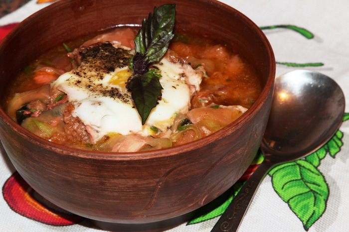 Яйца отдельно друг от друга разбиваем в плошку и осторожно выливаем по очереди в суп. Сверху присыпаем молотым черным перцем (в ингредиентах - горошком) и накрываем крышкой минут на 5. Белок должен прихватиться. Суп готов!