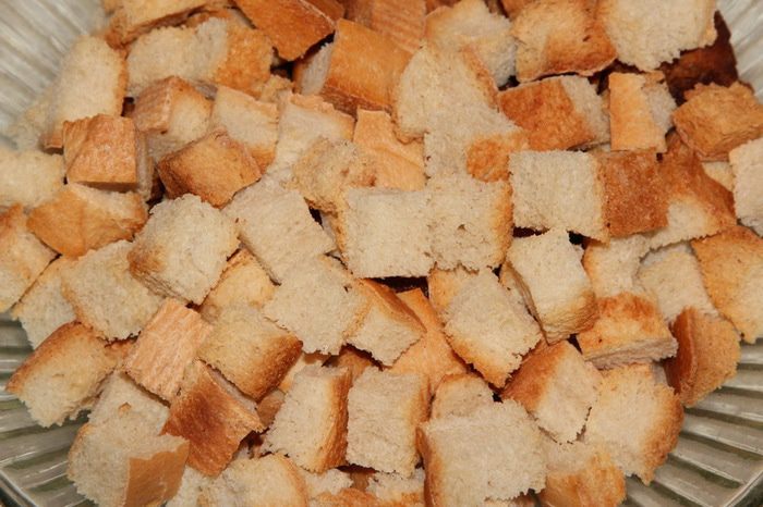 Для начала приготовим сухарики. Для этого порежем белый батон на небольшие квадратики, выложим на противень, сбрызнем растительным маслом и отправляем в разогретую духовку до подрумянивания.