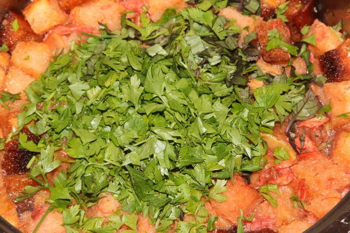Рубим зелень, у меня петрушка и зеленый и синий базилик. Все по вкусу. Добавляем в суп.