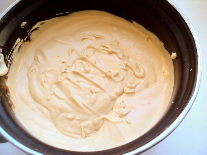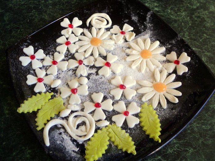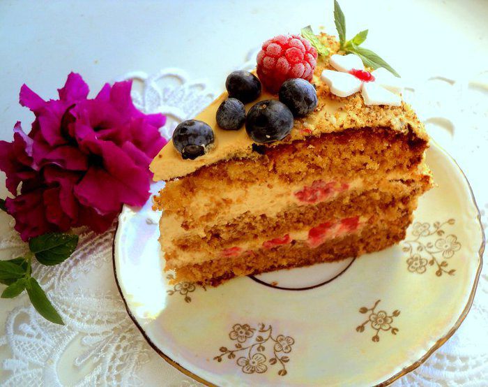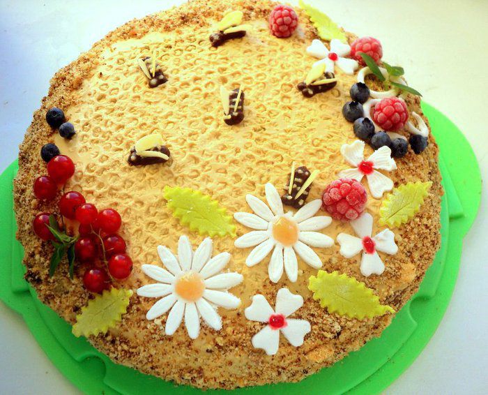 Сверху торт можно просто украсить ягодами, но я готовила торт в подарок, поэтому украсила еще и цветочками из готовой мастики. Мастику раскатать и вырезать цветочки и листики. Пчелки сделать из растопленного черного шоколада при помощи бумажного корнетика, полоски и глаза из белого шоколада, крылышки из пластинок миндаля. Охладить в морозилке.