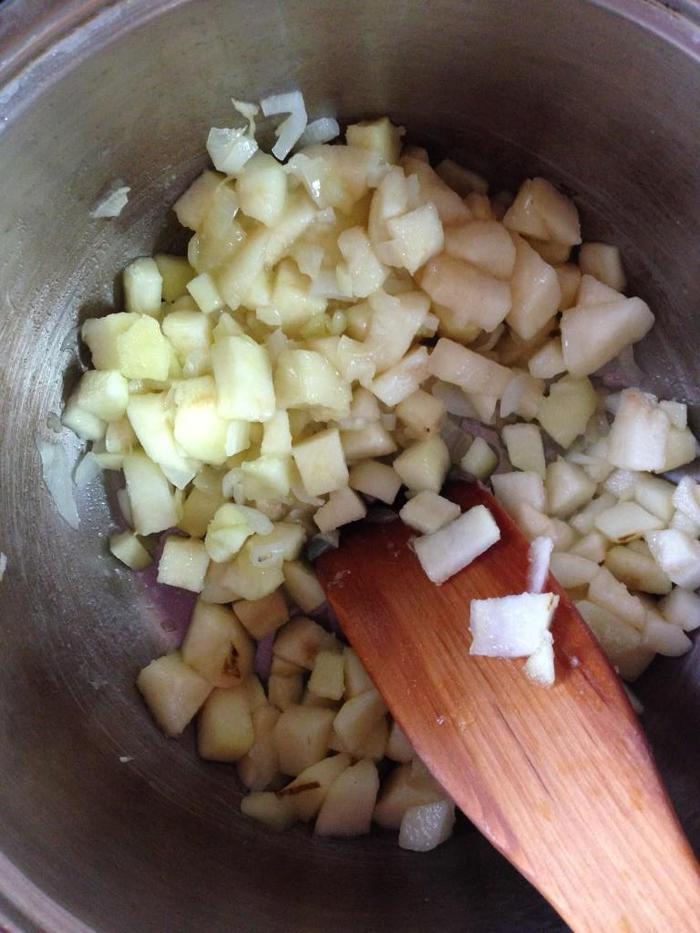 Помешивая, обжарим груши с луком минут 5, чтобы они пустили сок.