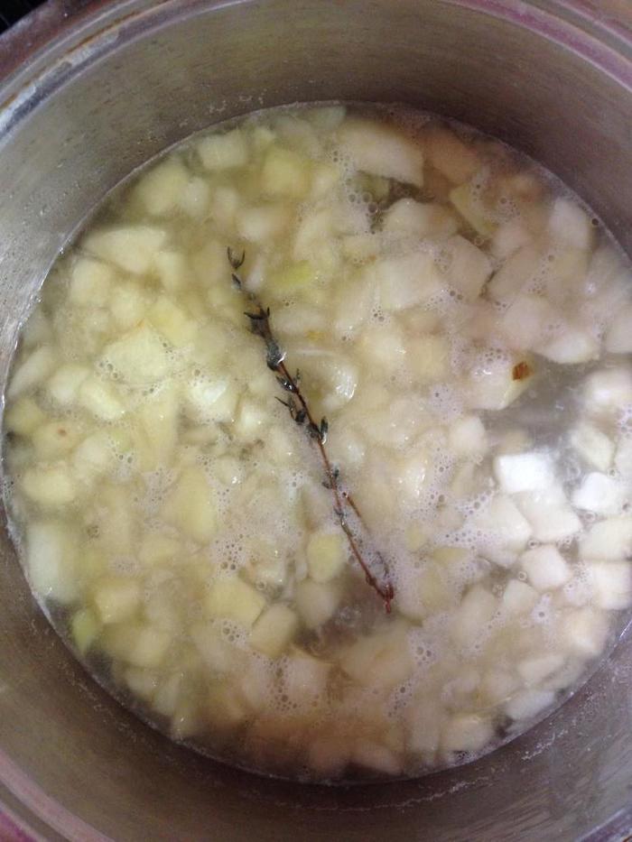 Вливаем горячую воду и варим после кипения, добавив веточку тимьяна, еще минут 10.