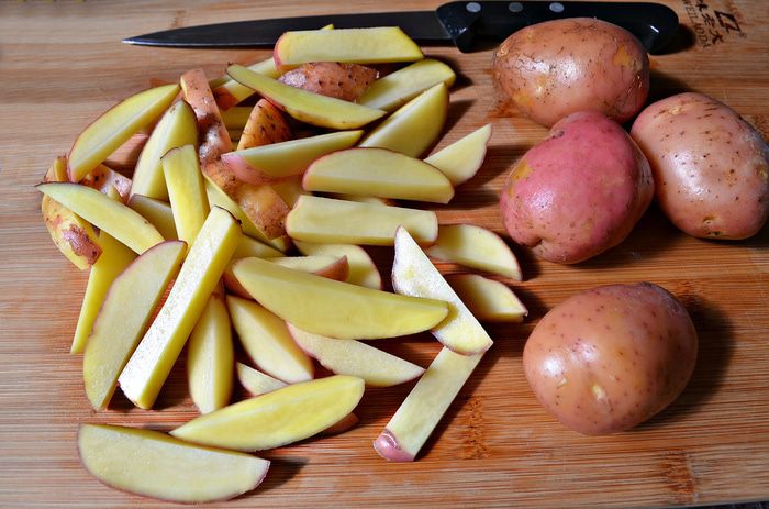 Картофель хорошо промыть. Лучше подойдут небольшие клубни. Поскольку я использовала молодой картофель с тонкой нежной шкуркой, я не стала её срезать, а лишь более тщательно промыла. Нарезать картофель ломтиками.