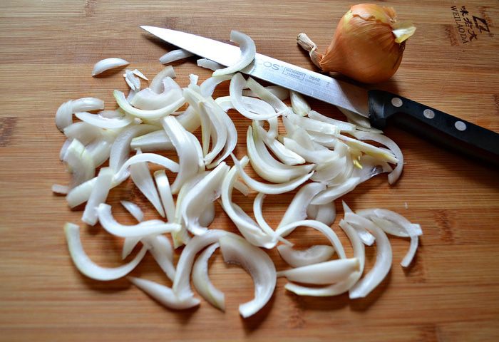 Лук очистить и нарезать полукольцами.