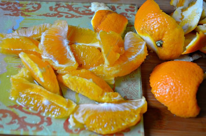 С апельсина срезать кожуру, мякоть нарезать дольками. Выделившийся сок собрать.