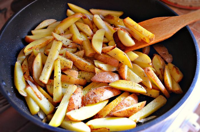 На оливковом масле обжарить лук в течение 2-3 минут. После добавить картофель и жарить на среднем огне до полуготовности.
