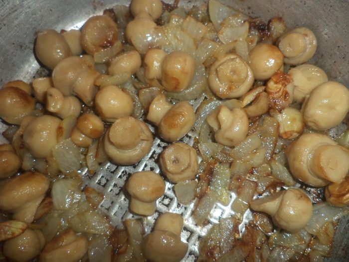 Мелкие маринованные шампиньоны откинуть на сито, слить жидкость, а грибочки добавить в сковороду к луку и обжарить до зарумянивания.