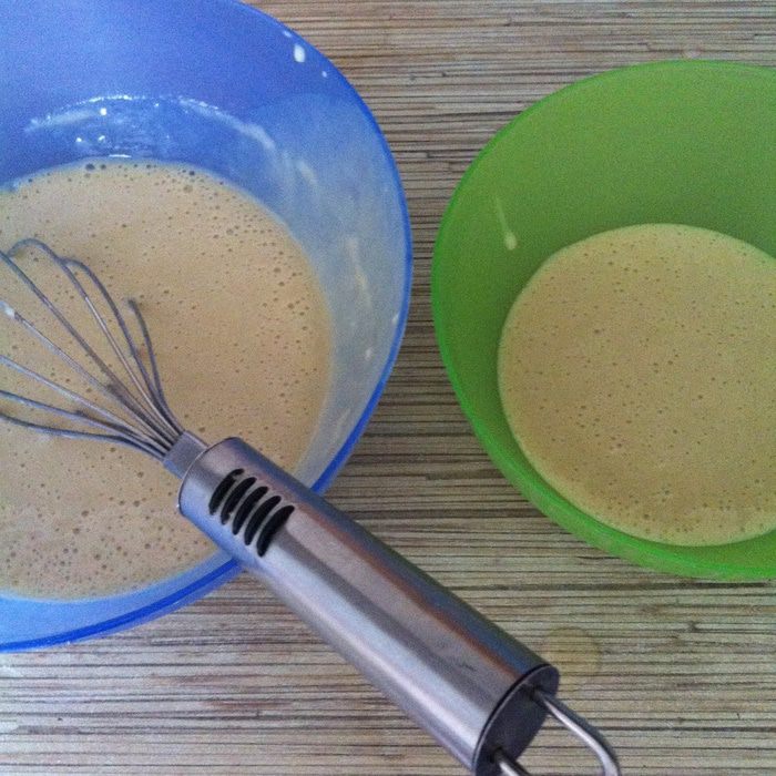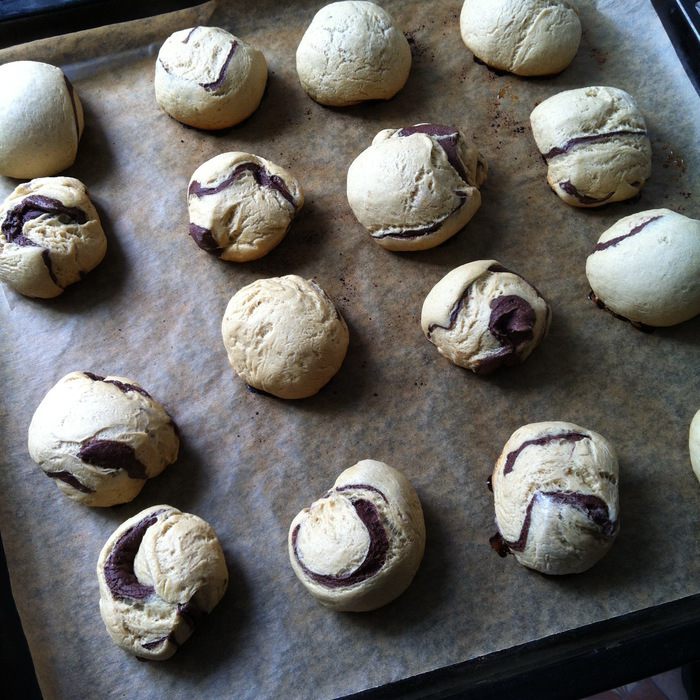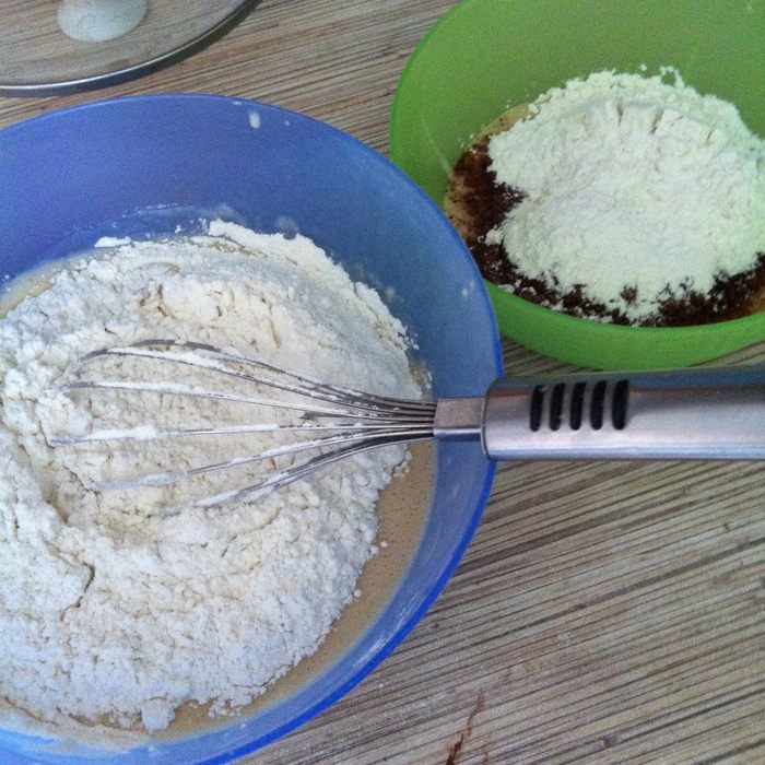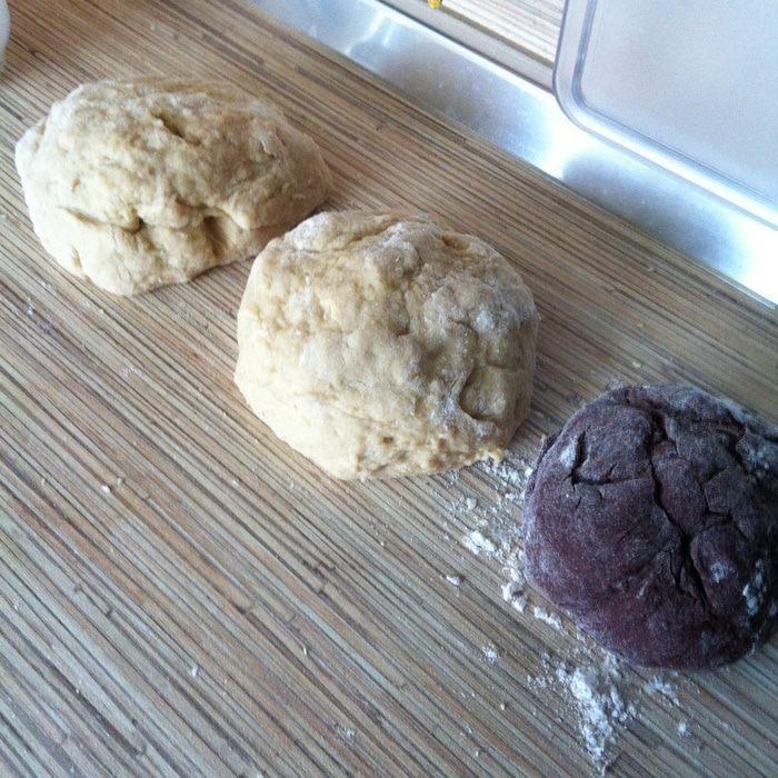 В миску с 1/3 частью теста добавляем столовую ложку какао с горкой, ароматизатор "ром" и 100 г муки, замешиваем мягкое тесто, оно не должно липнуть к рукам, поэтому по необходимости добавляете по одной столовой ложке муки за раз.