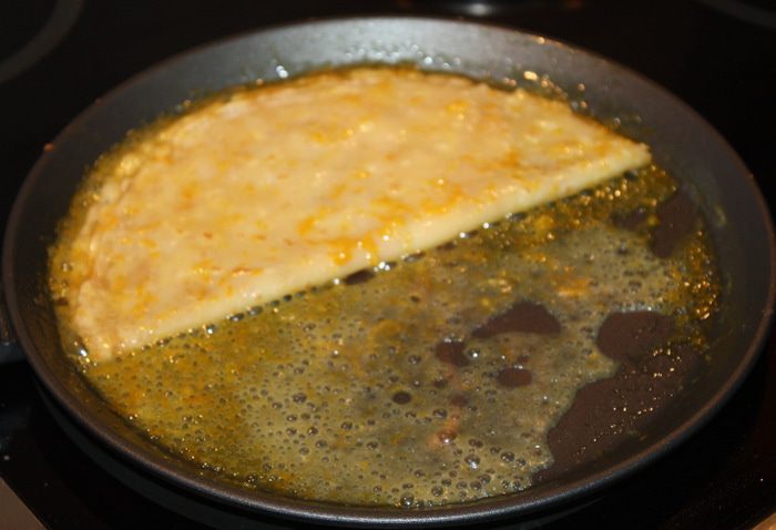 Складываем блин пополам. Затем добавляем коньяк и поджигаем, то есть фламбируем. Как только огонь погас, складываем блин еще раз пополам и выкладываем на блюдо.