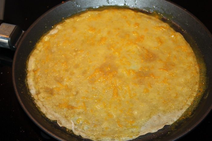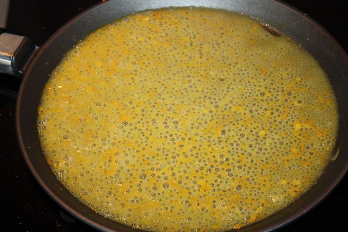 На разогретую сковороду кладем сливочное масло и всыпаем коричневый сахар. Как только сахар растворился в масле, добавляем цедру и сок. Даем соусу полностью соединиться (это занимает около минуты).