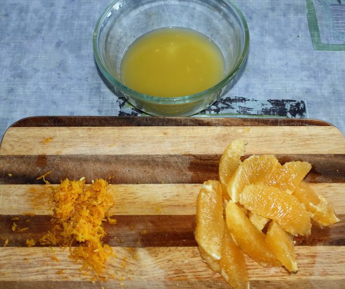 Цедру апельсина натираем на мелкой терке. Очищаем 2 апельсина и вырезаем дольки. Из одного апельсина выжимаем сок.