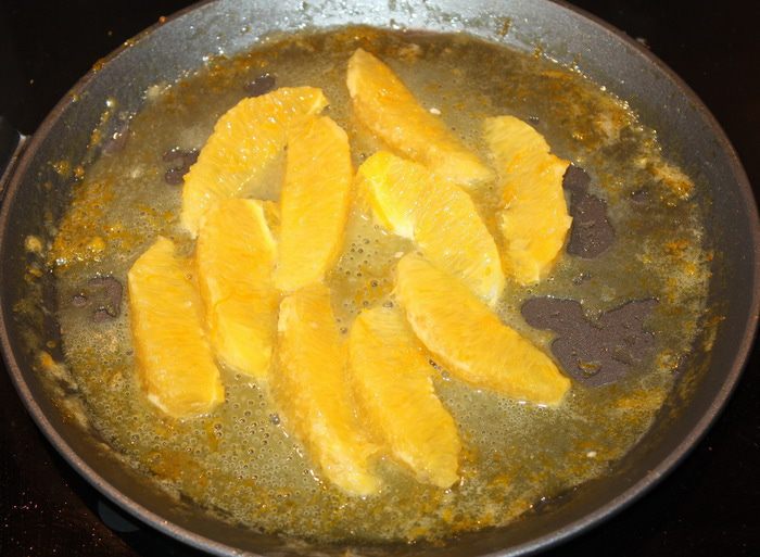 Апельсиновые дольки опускаем в соус, даем им хорошо прогреться, а затем выкладываем на блины.