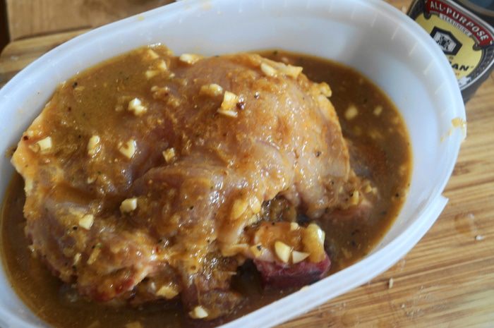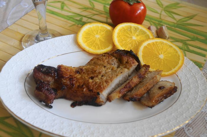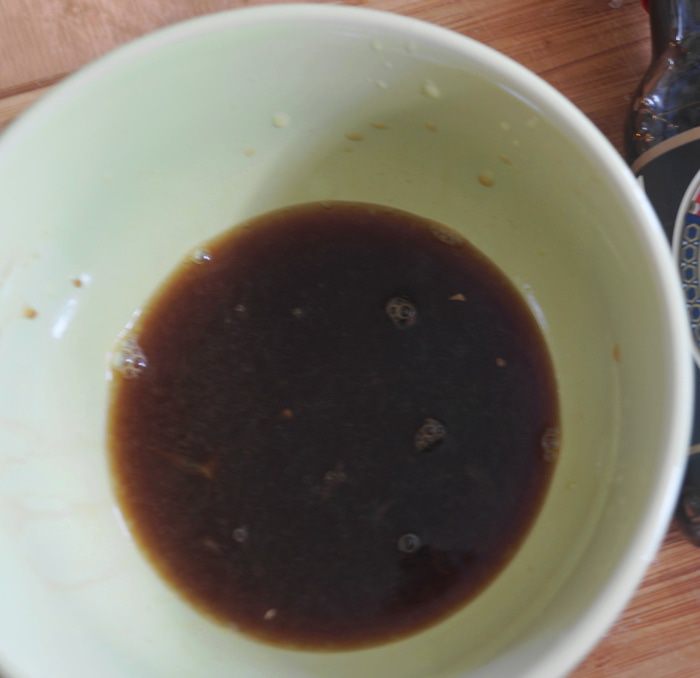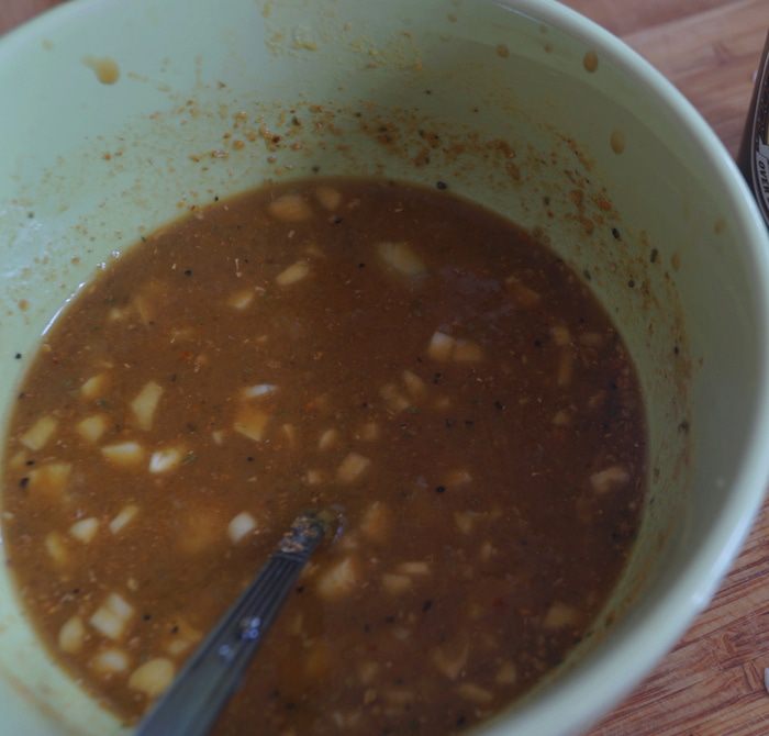 Лук превратить в кашицу при помощи блендера, можно натереть на терке. Чеснок пропустить через пресс. К смеси апельсинового сока и соевого соуса добавить кашицу из лука, чеснок, мед (если густой, то предварительно растопить его), горчицу, солим, перчим и приправляем специями. Хорошо перемешиваем.