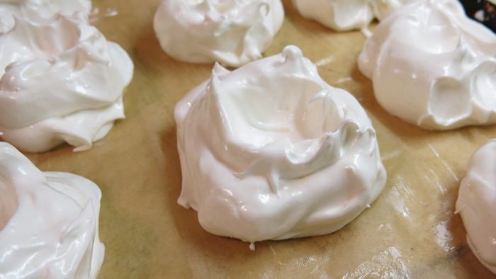 Ставим "облака-гнёзда" в предварительно разогретую до 180 градусов духовку. Закрываем её и сразу меняем температурный режим на минимальный.