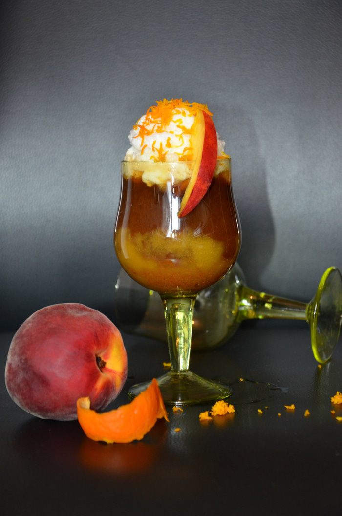 В прозрачный бокал или чашу наливаем персиковую массу (из шага 3), затем слой сиропа со специями и самым последним заливаем оставшийся свежесваренный кофе. Декорирует взбитыми 33-35% сливками с сахаром. Можно украсить по желанию. Я использовала цедру апельсина.