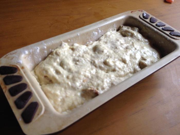Форму смазать маслом. Выложить тесто. Разровнять. Поставить в разхогретую духовку.