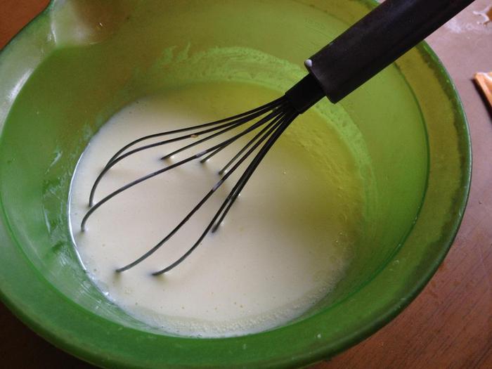 Добавить молоко и 4 ст. л. растительного масла. Перемешать.
