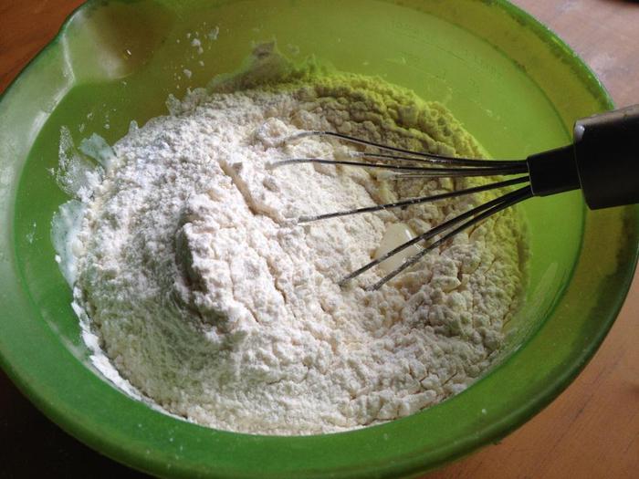 Ввести в тесто сыр и муку. Перемешать.