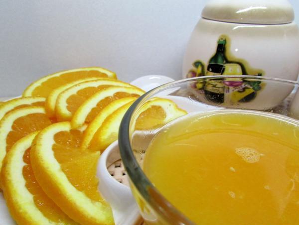 Сотейник с набухшим желатином поставить на небольшой огонь и готовить, размешивая и не доводя до кипения, пока желатин полностью не разойдётся. Снять с огня, добавить апельсиновый сок и бульон, перемешать. Дать остыть до комнатной температуры.