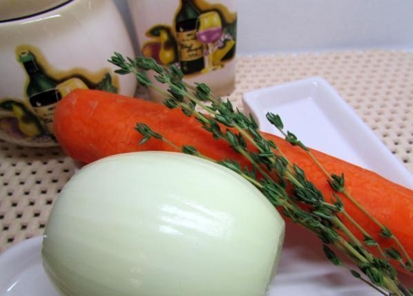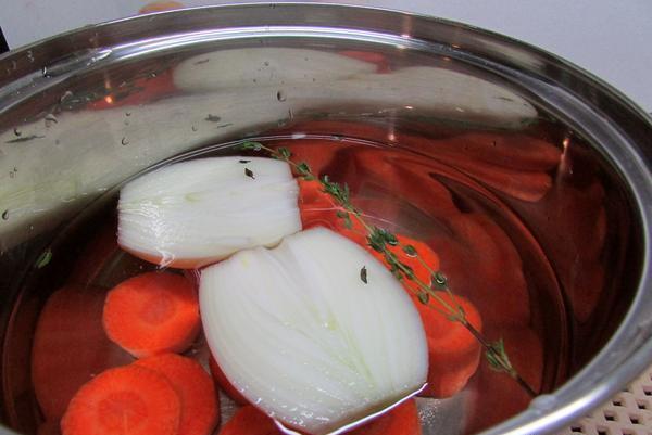 В кастрюлю налить 3,5 стакана воды. Положить очищенные овощи и тимьян, приправить солью, довести до кипения и варить 20 минут.