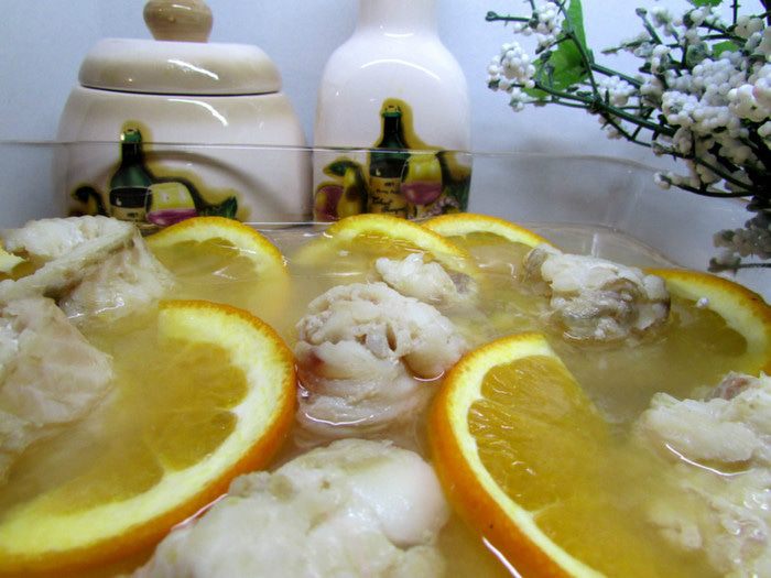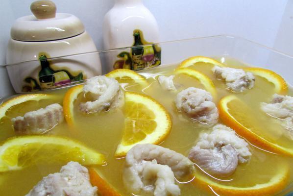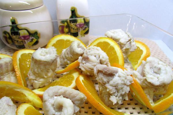 Рулетики из рыбы выложить в форму для заливного, перемежая их ломтиками апельсина.