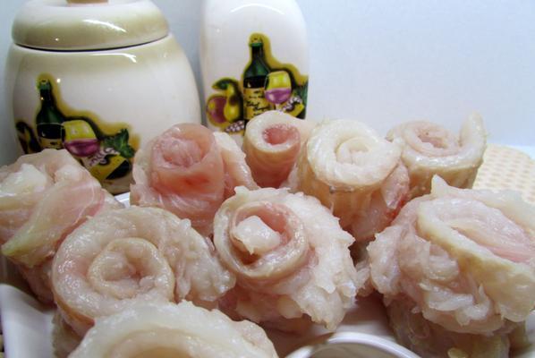 Свернуть в рулеты и перевязать ниткой (можно ускорить весь процесс с рыбой - купить готовые замороженные рулетики филе камбалы).