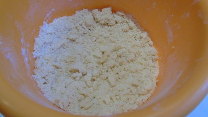 В муку добавить щепотку соли и холодное сливочное масло, перемешать в крошку.