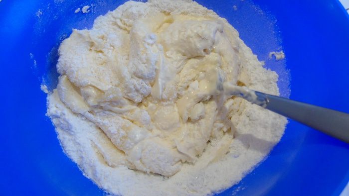 Сметану смешать с мукой и сахаром.