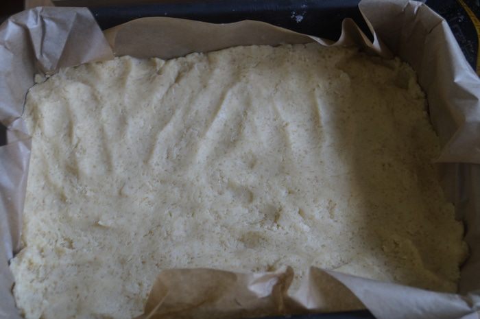 Готовый корж достанем из духовки и выльем на него крем, снова поставим в духовку на 20-25 минут. Крем должен стать упругим, но главное не передержать пирог, иначе крем станет излишне твердым.