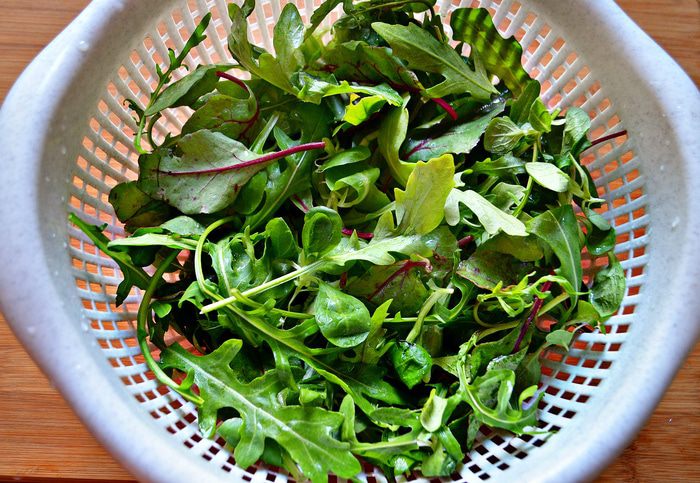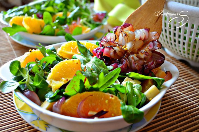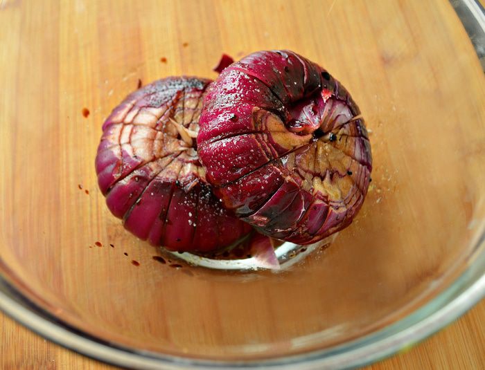 Красный лук очистить, сделать надрезы, но не до конца, разделив луковицы на 8-10 равных частей. Положить луковицы в миску и залить оливковым маслом с бальзамическим уксусом. Затем хорошенько обвалять лук в этом соусе, посолить, поперчить и выложить на противень, полив соусом из масла и бальзамического уксуса. Накрыть противень фольгой и запекать луковицы 20 минут при температуре 200 градусов, а затем еще 10 минут без фольги. Одну запечённую луковицу разобрать на дольки и добавить в салат, вторую - оставить для украшения.