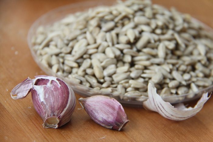 Чеснок выдавить через пресс. Семена подсолнечника слегка подрумянить на сковороде.