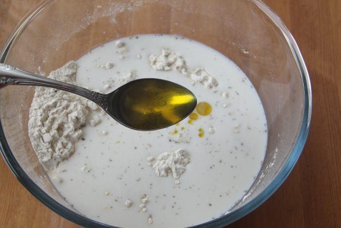 Соединить сухую смесь и жидкую, добавить чеснок и семечки, оливковое масло.