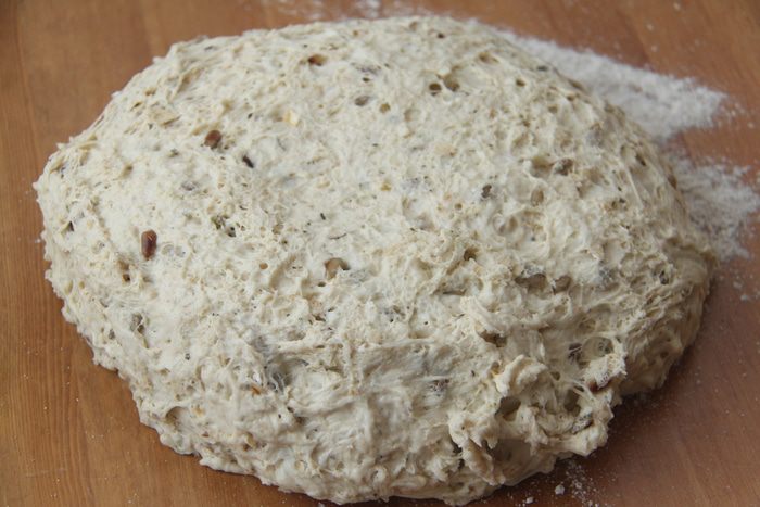 Через 2 часа выложить тесто на присыпанный мукой стол, обмять, сформировать батон, обвалять в ржаной или пшеничной цельнозерновой муке. Оставить на расстойку на 1 час, прикрыв полотенцем.
