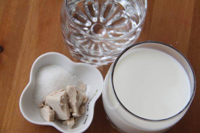 Соединить воду и молоко, слегка подогреть. Растворить в жидкости сахар и свежие дрожжи.