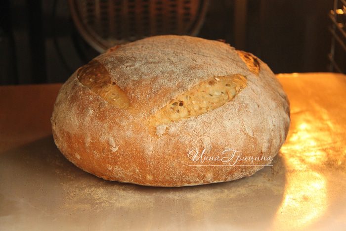 На хлебе сделать насечки. Выложить батон на горячий противень, выпекать при 250*С 10 минут, затем убавить температуру до 180*С и выпекать ещё 25 минут. Остудить хлеб на решётке.