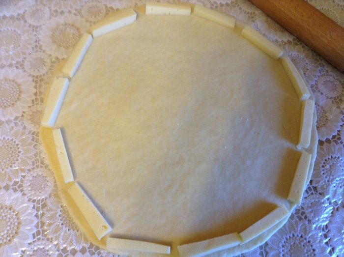 Раскатать тесто в круг, по краю выложить остаток сыра нарезанный брусочками.